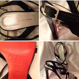 🔴SOLD🔴High heels, sequins, patent leather oh my! These sexy sandals by Costume National are made of black leather straps and silver sequin strip draping the toe area. 4" black patent leather heels. Open toe. Silver hardware. Silver CNC logo charm at the buckle. Adjustable buckle. Leather insole stamped with logo. Signature red leather soles embossed with logo and Made in Italy. Little wear and price tag on sole--see pic. Sequins intact. Heels free of scuffs. In excellent pre-owned condition.