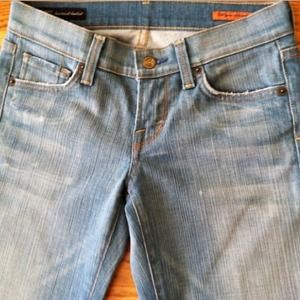 These are in beautiful condition look and feel brand new! 7" rise and 34" inseam. These have a beautiful light wash!