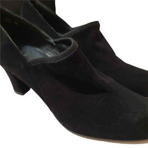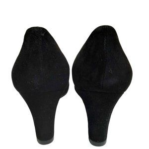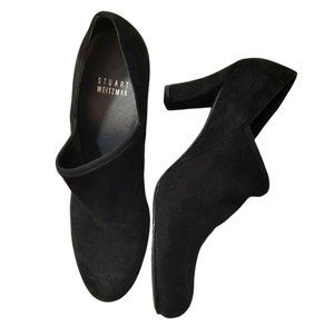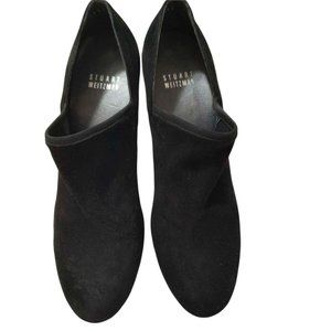 Very comfortable black Stuart Weitzman suede slip-on heels with elastic front trim.