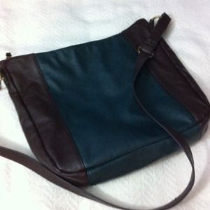 With minor tear at the inside of the pocket, combination of brown, yellow green leather crossbody bag