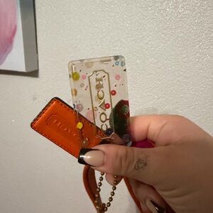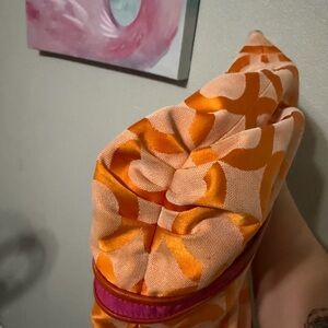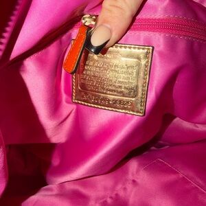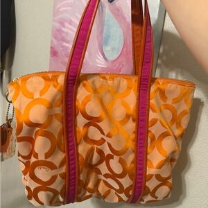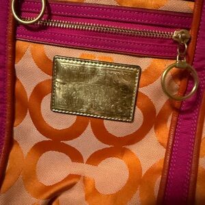 Stylish Coach tote in vibrant orange with bold pink trim. Durable signature jacquard fabric with gold-tone hardware. Multiple exterior pockets and top zip closure for easy access. Eye-catching orange and pink colorway perfect for everyday wear.