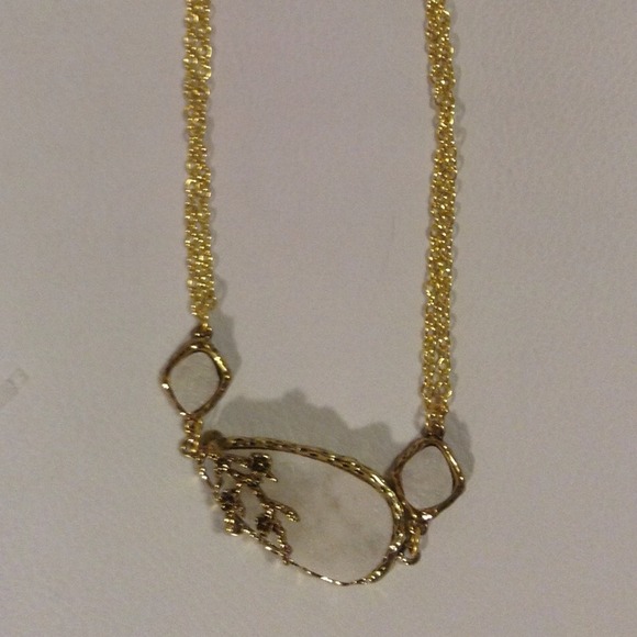 Has a gold chain with a white stone embedded. It is handmade.