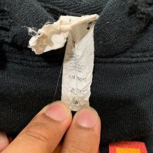 The hoodie is used, The really only flaw is that the drawstring "shown in the pictures" where it comes out is ripped. It can be fixed or left like that for style. Overall a vintage look and in Good Condition!