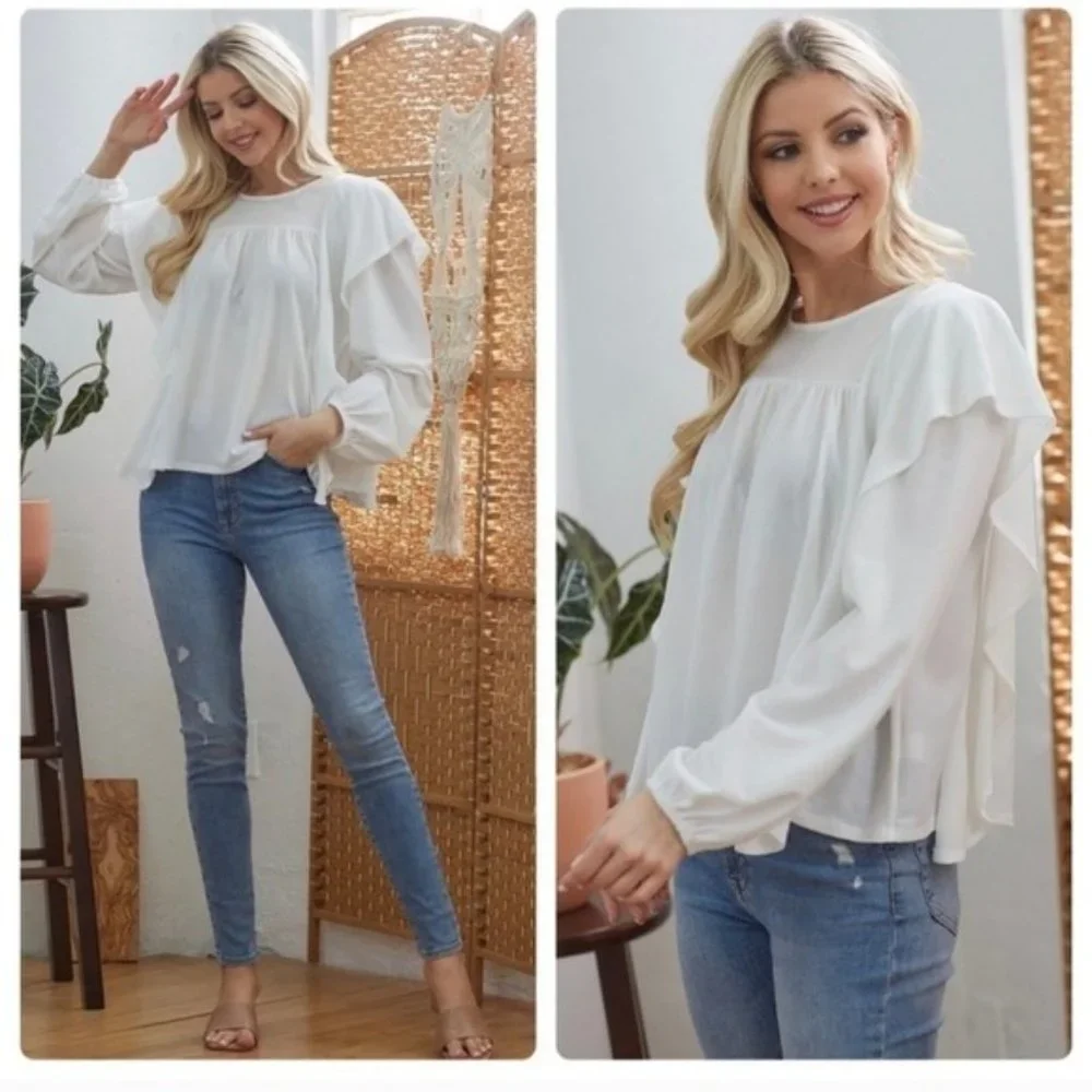 DRAPED RUFFLE TOP. LONG SLEEVES. COLOR: WHITE
