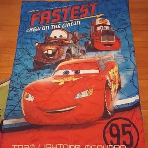 Disney cars toddler bedset with comforter, 1 pillow case, fitted sheet, and a flat sheet. All bedding shown. No stains or signs of wear. Pictures of McQueen, Mac, and Mader. Will ship 💥IMMEDIATELY 💥 upon purchase.