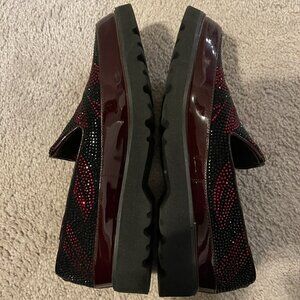 Crystal pattern is red and black; leather part of shoe is burgundy.