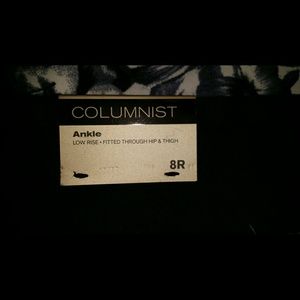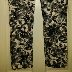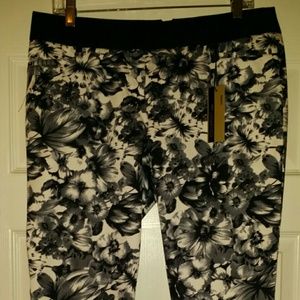 Black, white, gray floral print. Fits just below waist, tailored leg lengthening, slimming effect. Fitted through hip & thigh. Size 8 with 1% spandex Reg. $69.90