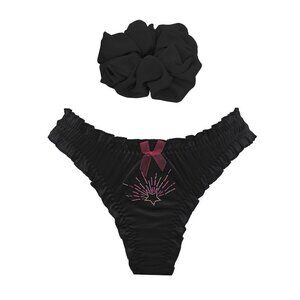 The matching set you never knew you needed: this sweet satin thong (with delightful star embroidery and organza bows) with a coordinating black scrunchie!