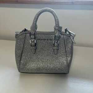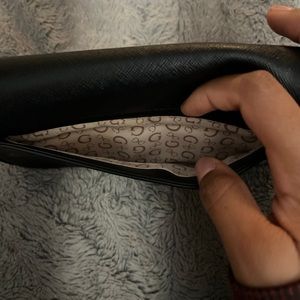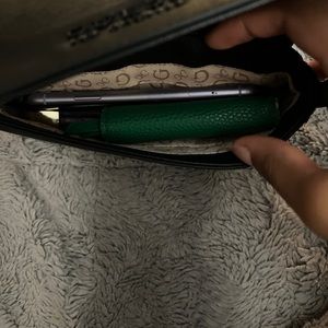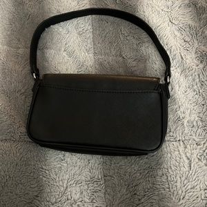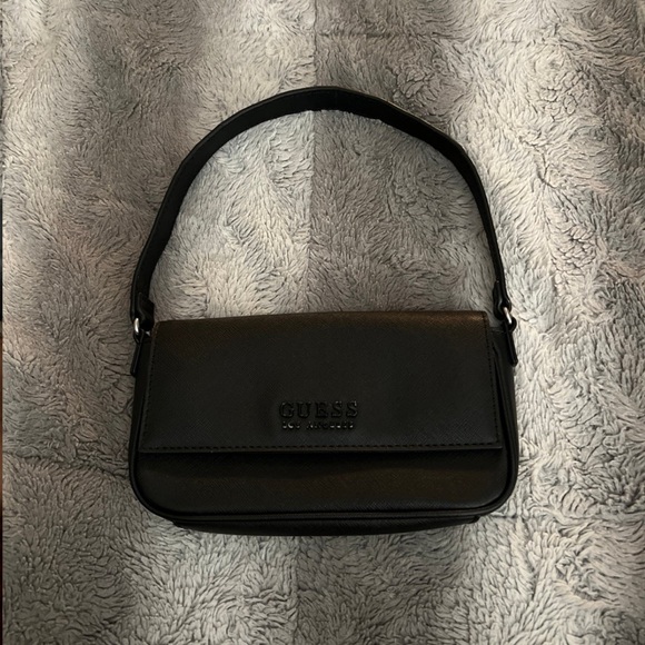 Small GUESS black shoulder bag. A little worn, but still in good condition! Pictures of deficiencies are in listing. Big enough to fit phone, keys, small wallet, and a few other small things. The perfect going out bag!