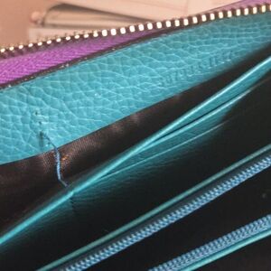 This Gucci long Ziparound Continental Wallet by Tom Ford is preowned and in very good used codition. It shows normal signs of wear: rubbing on corners and edges, some minor discoloration, residue and minor separation at interior in one of the compartments. Two tone: Teal and purple leather featuring bamboo tassel zipper pull. Japanese Exclusive Gucci Wallet
