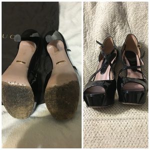 Beautiful authentic Gucci heels with dust bag. Love these shoes but please look closely at the pictures. There is a small scratch on the back of one shoe and the elastic is lose on one shoe also. All of these details are shown in the pictures. I wore the shoes with the elastic lose and it has been fine. I believe if you bring them to a a shoe repair person and they can fix this. I paid $900. I wear a 7 1/2 or an 8 and these fit perfect