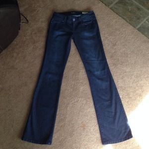 Dark blue denim wash with dark purple stitching and accents(buttons)! Beautiful and look brand new only wore once! Medium rise boot in the Sarah fit. 72% cotton 26% polyester 2% spandex for the perfect fit and feel!