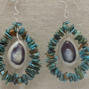 For the Turquoise lover, an array of blues browns and greens in the delicate stones strung into a teardrop with Sterling Silver. At the center of each earrings is a purple and white Cowrie Shell.