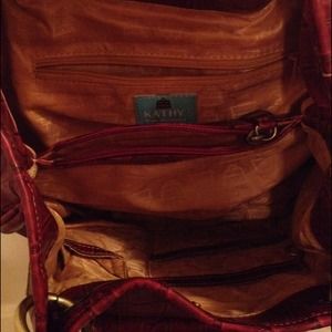 Kathy Van Zeeland, Burgundy, croc-embossed purse w/gold hardware & cosmetic bag w/mirror with a few tiny scratches, that is only flaw.'Front pocket snap has lg KVZ crown, top zipper has gold heart pull, side pockets w/gold studs and back zipper has gold heart pull. Has removable KVZ charms, inside zippered pocket, 3 accessory pockets & center zipper pocket. Gold lining✳️Measures 13"x 10", 10" double handles✳️Matching Cosmetic bag w/mirror & inside Keyring w/top zip ✳️measures 6 1/2"x 4"✳️