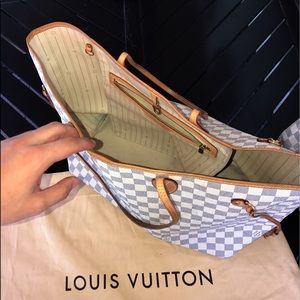 Louis Vuitton large tote bag. Item is 100% AUTHENTIC and in great condition :) Has been used a handful of times. No signs of wear and tear. "Legendary Neverfull: always exactly what you need it to be. Capacious but not bulky, structured yet supple, at home on the town or in the country. Cinch the side laces, and voilà! it's a sleek city bag. Loosen them and you have a chic, practical tote. The slim leather handles fit over the shoulder or on the arm. Shown here in Damier Azur canvas."