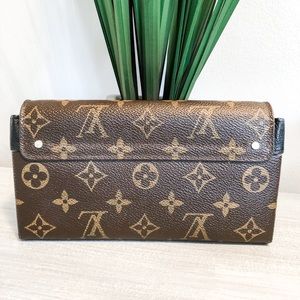 Luxurious Bordeaux calf leather, beautiful Monogram canvas, and a golden brass Charniere S-lock add to its timeless charm.The interior boasts 12card slots and several open compartments for storing all of your cards and cash. Very Good Pre-Owned Condition. The exterior has no flaws to mention, no cracks, tears, fades or scuffs. Just light wear where the clip is.The interior is pristine, no marks. The zipper works perfectly the brass is still beautiful and vibrant.Made in France Date Code SP4163