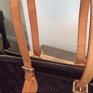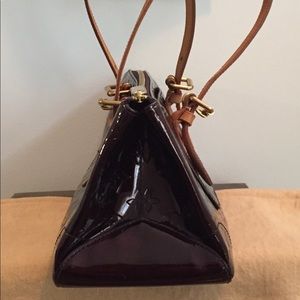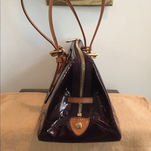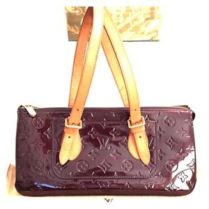 Louis Vuitton Rosewood Vernis Amarante M93510 (purple & red tones). Vachetta light honey patina. One exterior slip pocket & one interior slip pocket. Date code: FL8017, made in France. L12.6” x H5.9 x D5.5”, adjustable straps 24.2”
