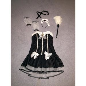 Includes: Puffed sleeves, Headband, Tie choker ribbon necklace, Duster, and Dress. Dress is strapless and does not come with clear bands to hold up. Need at least a B cup to hold up. Size medium fits girls 4-6 very comfortably, size 8 fits much tighter. Costume is stretchy. Only worn once. Is machine washable.