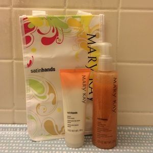 BRAND NEW, NEVER OPENED! WILL BUNDLE!! Mary Kay Peach Satin Hand Scrub and Hand Cream. Peach Hand Scrub 7.75 oz, Peach Hand Cream 3 oz, Bonus super cute tote bag. Reusable tote bag is swirled with pink, green, yellow, orange and brown.