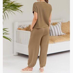 -Design: Top: front pouch pocket, crew neck, rib-knit fabrication; Pants: side pockets, tapered silhouette, pull-on style. Perfect for lounging, brunch, and beyond.