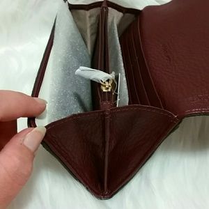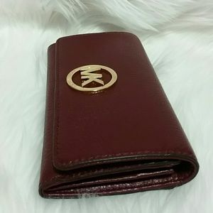 Michael Kors Fulton Carryall Wallet, NWT, Authentic, Merlot in color (wine), Accordion style, snap front closure, 14 card spots, zipper middle insert for change. Super soft pebbled leather. Gold Hardware.