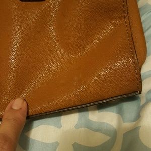 Bag is in good condition. No reaps or tears . However is has some dark spots in front and back . Very small not noticeable. The inside is a little dirty as well . Haven't take it to clean so they might come off. It has handles and a shoulder strap