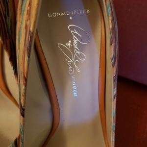 These Donald J Pliner 4" heels are classy AND edgy! SUCH pretty, muted colors on a tan cork🍾 background.