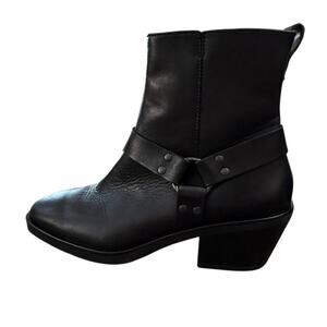Merging moto and rancher, this harness strap bootie is both durable and versatile with its elongated toe and sturdy block heel.