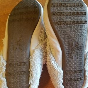 Brand new slippers by DearFoam. Gray with sweater looking foot bed with memory foam. Keep your feet warm this winter while keeping them comfortable too! Can be worn outside with the rubber soles. ** Please note what looks like a manufacturer defect on the back of the slippers(see pic 2) This does not affect wear just want to make sure buyer is aware. Any questions please ask. %15 discount on bundles of 2 or more items. Thanks and Happy Poshing
