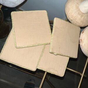 Set of coasters with bee embroidery. Features green and brown accents on a cream background.
