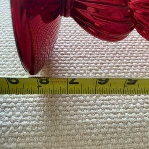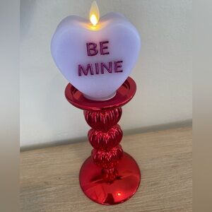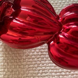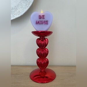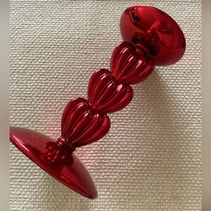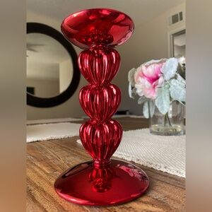 Add a touch of romance to your home with this elegant red heart chrome 3 wick candle holder. In great condition never used there are a couple minor hairline chips as pictured. Never used. Measurements posted in photos. Purple candle not included.