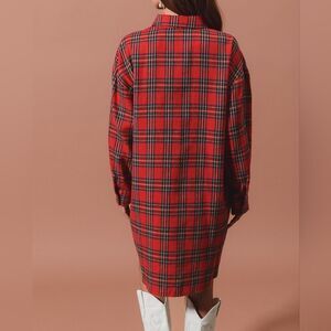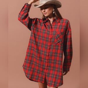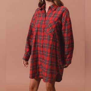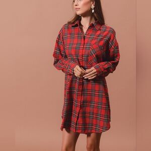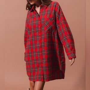 Get into the holiday spirit with this comfortable Red Plaid Oversized Shirt Dress. Featuring a button-down front, long sleeves, and pockets for a versatile, casual look. This Red Plaid Oversized Shirt Dress is a stylish and comfortable choice for any occasion. Made from a soft and breathable fabric, this dress features a classic plaid pattern, button-down front, and chest pocket detail. The oversized fit and shirttail hem add a touch of casual flair, while the long sleeves make it perfect for layering. Dress it up with heels or keep it casual with sneakers for a versatile look.