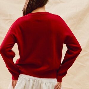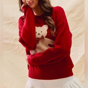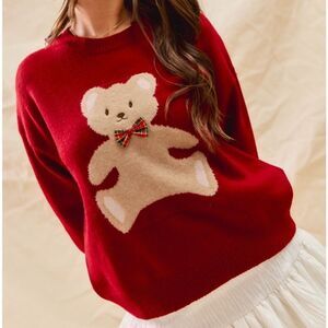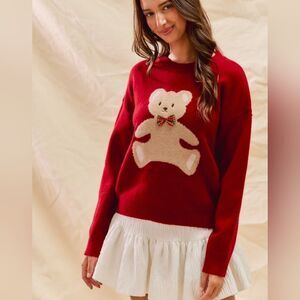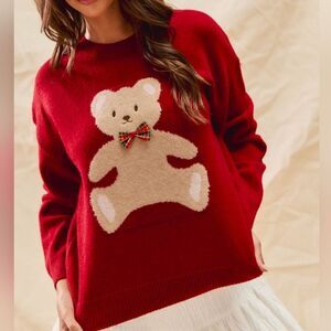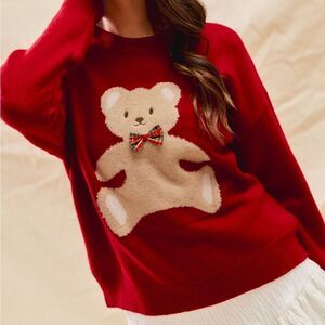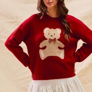 Cozy red sweater featuring an adorable teddy bear design. Perfect for adding a playful touch to your outfit.