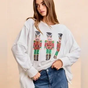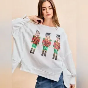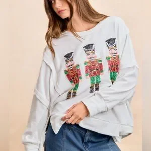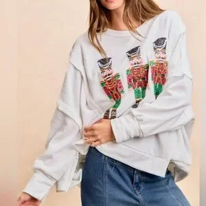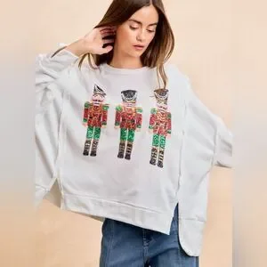 Get ready for the holidays with this cozy oversized crewneck sweatshirt! The soft cream/off-white fabric provides a relaxed fit, perfect for lounging or casual holiday parties. It features a festive and colorful Nutcracker toy graphic on the front, making it a perfect Christmas or seasonal top. The relaxed, slouchy silhouette and long sleeves ensure comfort and warmth. Pair it with leggings, joggers, or jeans for an easy, cheerful winter look. Holiday novelty wear that's both stylish and comfortable.