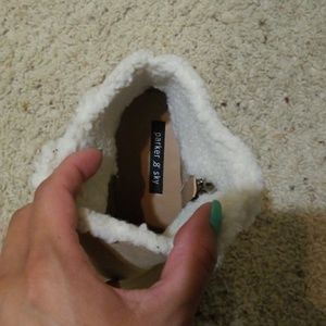 WORN ONCE. Wedges ankle bootie. Light tan/ Taupe color. Wool inside ankle area. CLEAN. WARM. SIZE 8.
