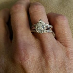 Size 7.5 gorgeous pear shaped white gold diamond ring with 3/4 carats of diamonds along with a 1/4 carat diamond rose gold enhancer. These rings are stunning together! Both from Helzberg jewelers and comes with box from Helzberg as well.