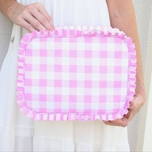 This pouch has the perfect combination of gingham and ruffles. Great for an travel, diaper bag pouch, or present for the new mom-to-be. It is made with a wipeable nylon material with a top zipper closure. Dimensions: 9.5" tall by 12.5" wide 4.5" wide base