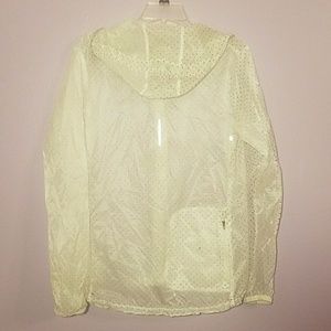Super lightweight rain jacket. Has reflective accents on the back and the swoosh on the front is also reflective. Great for a run in light rain. Looks beige In my crappy lighting but it's white and black like the covershot. In EUC.