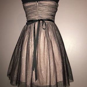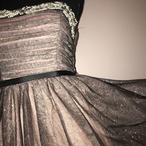 This is a beautiful formal dress. Sparkling dazzle shines through out this black over peachy pink sweetheart dress.