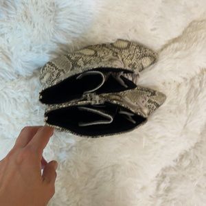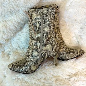 NIB python print vegan booties are looking for a new home home. Laced up design with a side zipper for easy access. Cushy lining for extra comfort. Gold detailing throughout making them sparkle with the light.
