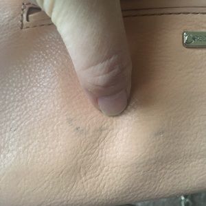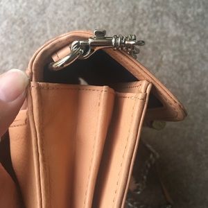 Pinky-peachy wallet on a chain. Has 13 credit card slots, two internal "pockets" and a coin pouch in the middle. The back has a pocket as well. There are signs of wear on the back side. See pictures for details. I purchased this bag 5 years ago. Used a handful of times for two years during vacations. I do not reach for it anymore. Time for a new home! 😊