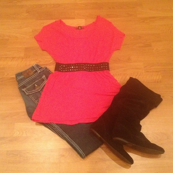 Red elastic waist with stones. Looks great with skinny jeans and boots or heels. Cute for dinner or a night on the town.