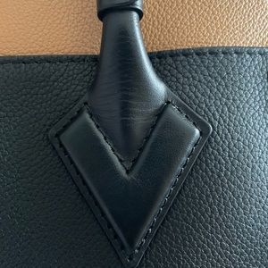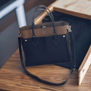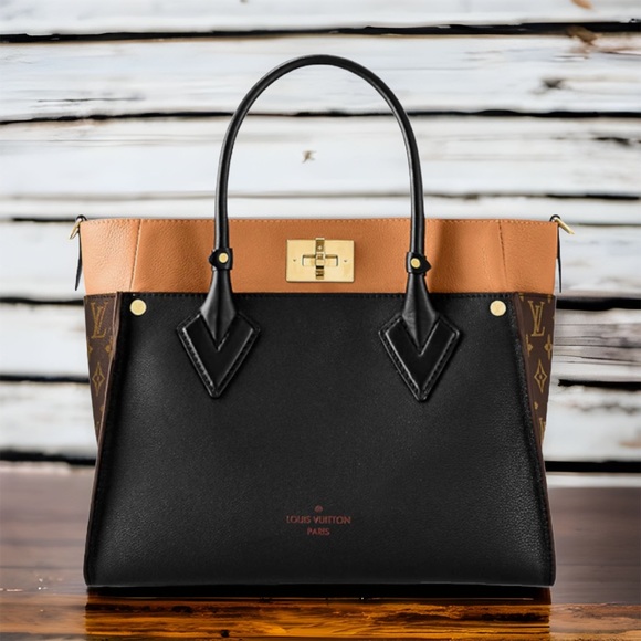 Authentic Louis Vuitton On My Side MM tote bag is fashioned from an elegant combination of small-grained calf leather and emblematic Monogram canvas. The large outside pockets in contrasting canvas create a bag-in-a-bag look. The roomy interior can easily hold everything needed for a day at the office while the adjustable strap makes for practical cross-body carry. Made in France