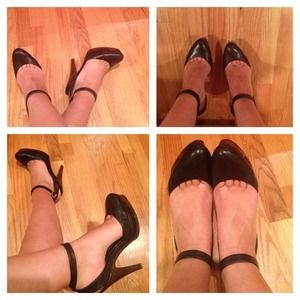 Gently used authentic Ferragamo black super soft leather ankle strap sandals. Wooden hill. Front platform has see thru hole, very unique.