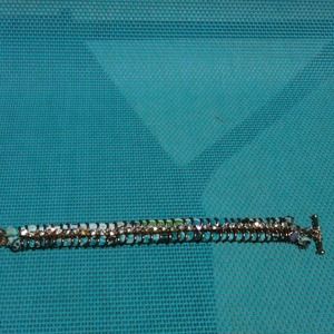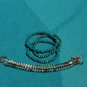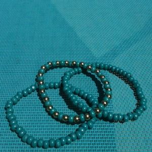 Four fun and flashy turquoise bracelets. One is a set of three that stretch to fit. The other is a fashion forward, beautifully studded, fabric wrapped bracelet. The studded bracelet is missing 1 stud.