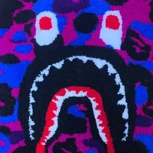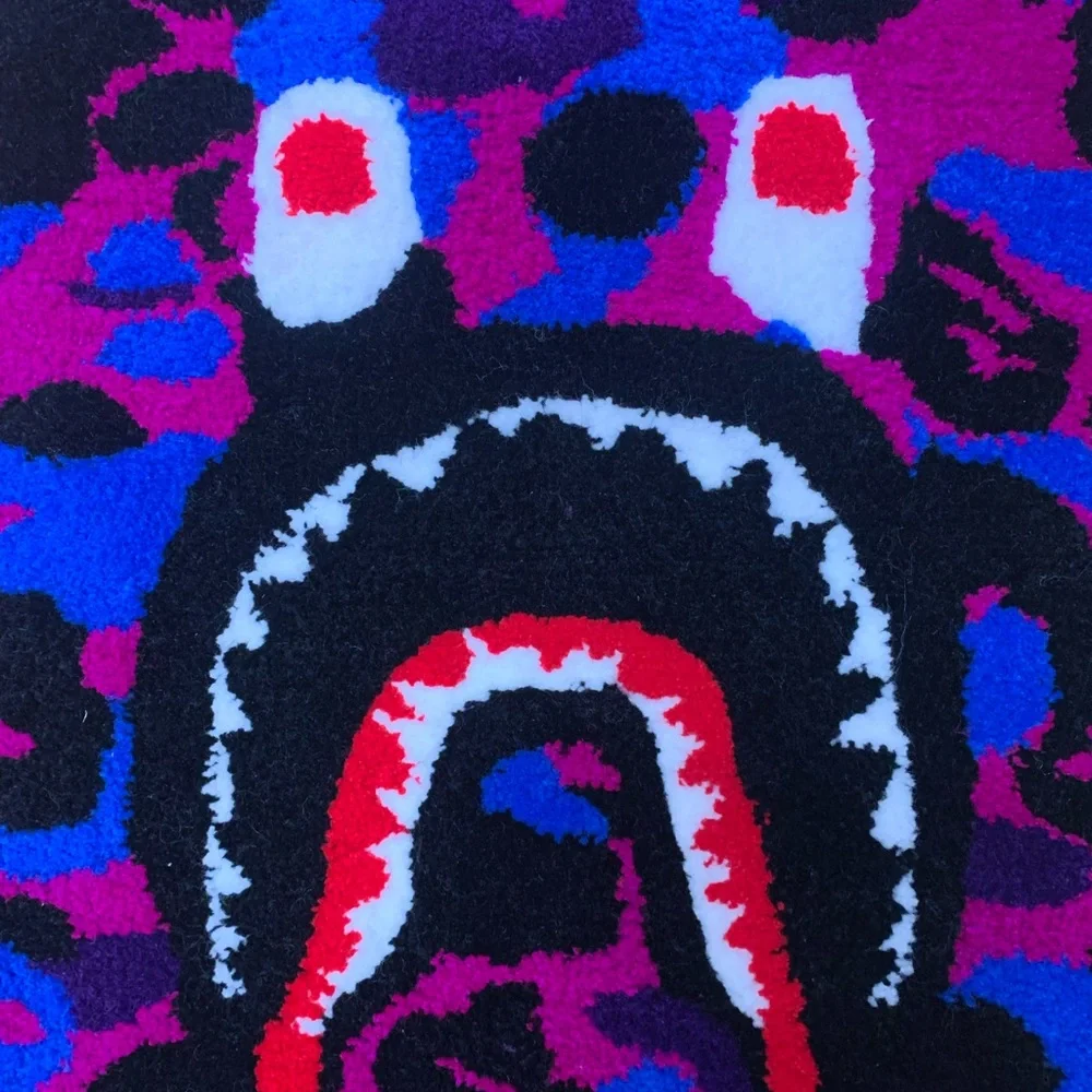 Add a bold statement to your space with this multicolor camo pattern Bape Shark rug. Featuring vibrant shades of red, blue, and purple, this piece is perfect for adding a pop of color to any room.