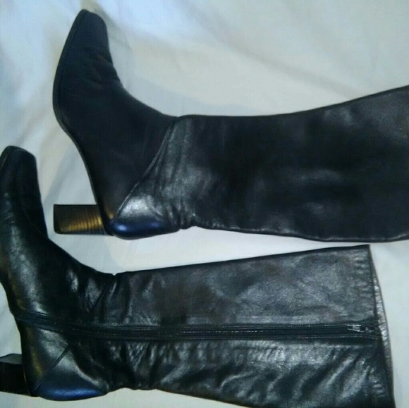 to-the-knee boots, stretch leather with a sleek block, inside full length zipper,