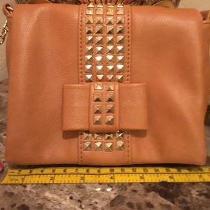 Tan leather like material mini purse w/gold accents. Used but very convenient and handy.