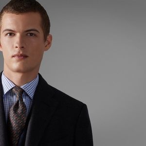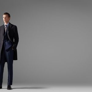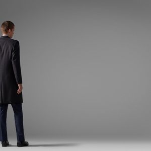 This winter coat is crafted out of wool with an added touch of cashmere, for ultra comfort and warmth. It is decorated with a subtle herringbone design and is finished with horn buttons and a structured, single breasted cut.