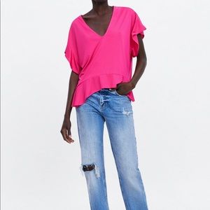 Ruffle top Full cut V-neck top with short sleeves Fuchsia